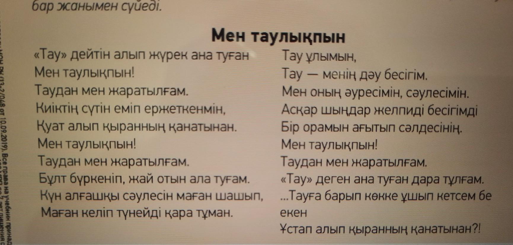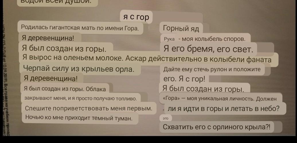 Я с гор, родился от великана по имени Гора. Я сын горы, я с горы! Тай — моя гигантская колыбель. Я его аура, его свет. Я был создан из горы. Я рос на оленьем молоке, Аскар не особо нянчил моего ребенка, Высушил булочку и надел ее. Я с гор! Сила исходит от крыльев гигантского орла. Я с гор! Я был создан из горы. Я был создан из горы. Я родился под воловьим покровом и только на дровах. «Гора» родилась одна. ..Хочется забраться на гору и полететь к небу.Солнце светит на меня своими первыми лучами,и надвигается черный туман. Будете ли вы держать его за крылья орла?!