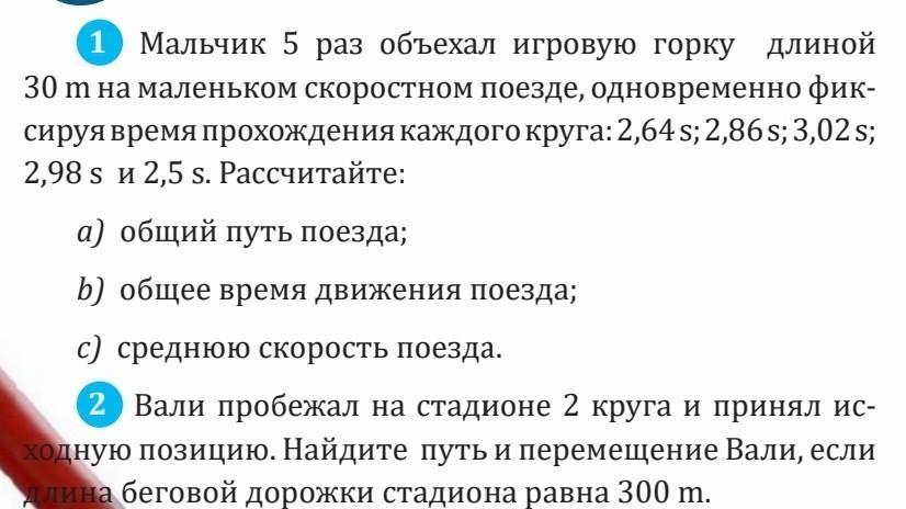 1 Мальчик 5 раз объехал игровую горку длиной 30 м на маленьком скоростном поезде, одновременно фик сируя время прохождения каждого круга: 2,64s; 2,86s; 3,02s; 2,98 s и 2,5 s. Рассчитайте:а) общий путь поезда;