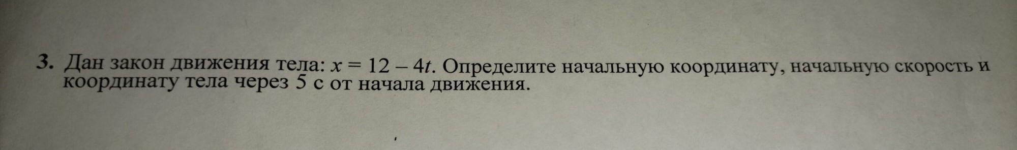 3. Дан закон движения тела: х=12-4t Определите начальную координату, начальную скорость и координату тела через 5 с от начала движения.помогите срочно сор2