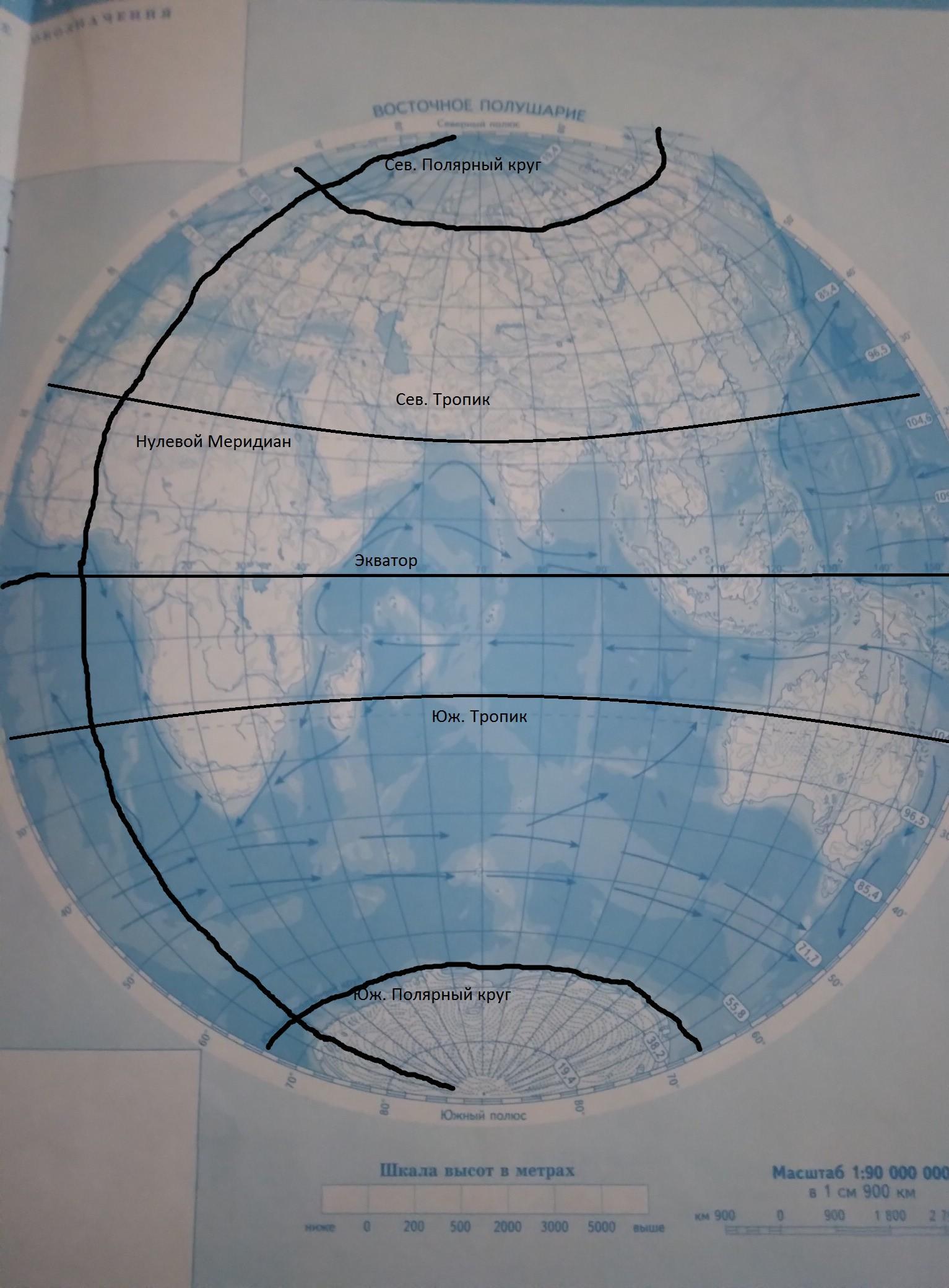 4. Найдите на физической карте полушарий эквато нулевой меридиан, полярные пояса, линии тропиков запишите их названия на контурной карте.