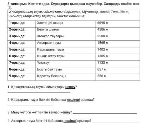 Відповідь:1.Сарыарқа,Мұғалжар,Алтай,Тянь-Шань,Жоңғар,Маңғыстау таулары.