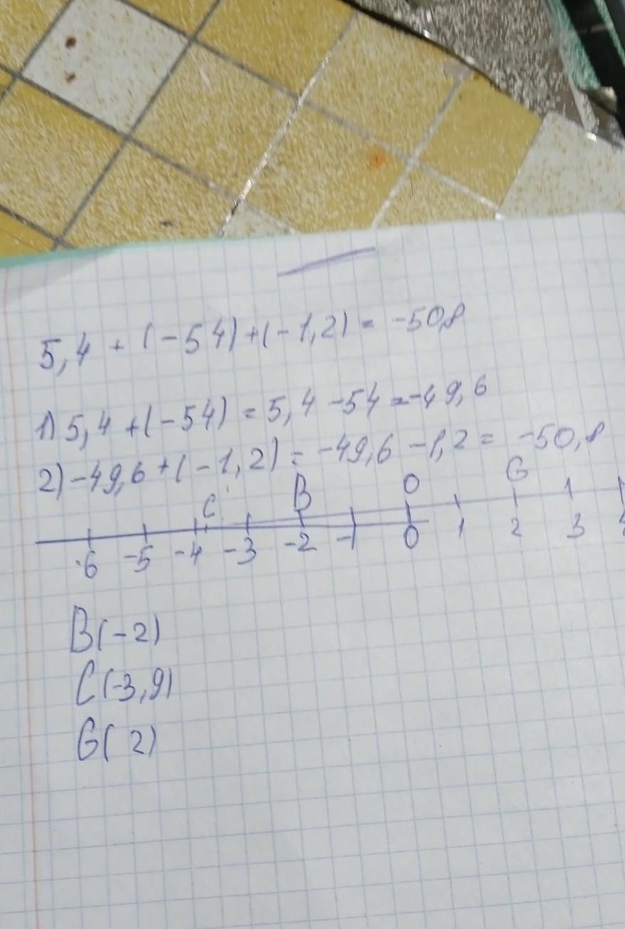 - Вычислите: 5,4+(-54)+(-1;2) - Даны точки B(-2) и С(-3,9). Найдите координату точки G, противоположную координате точки В. . Изобразите точки В, С и G на координатном луче. Найд ите расстояние от точки С до точки G. 7 50 балов даю