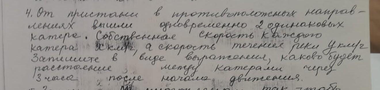 от пристани в противополжных направлениях вышли одновременнл 2 одинаковых катера. собственная скорость течения реки y км/ч. запишите в виде выражния, каково будет 3 часа после начала движения