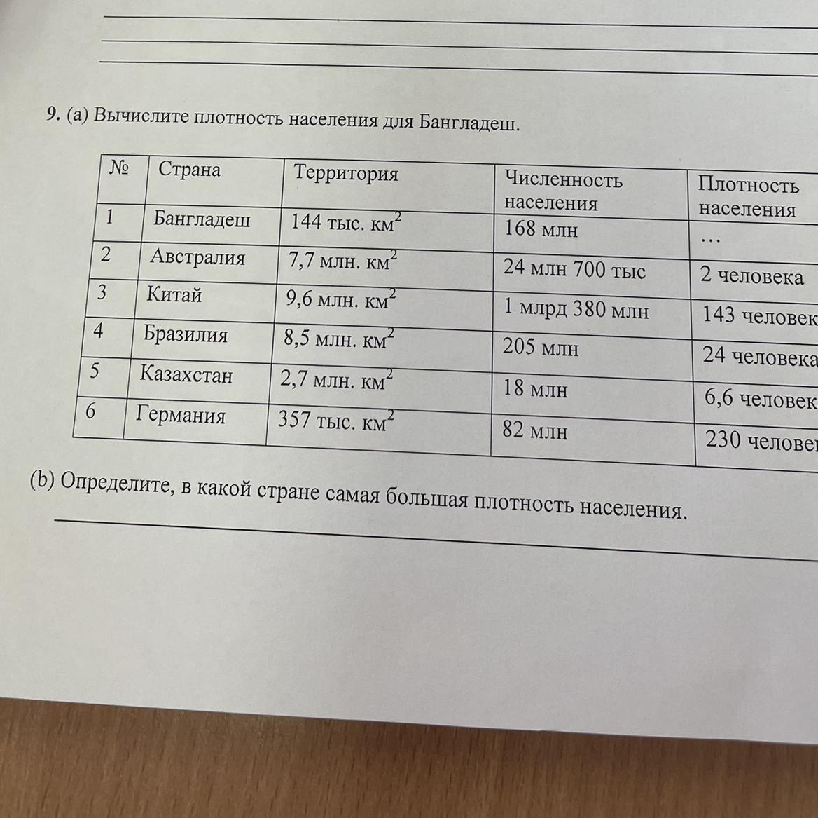 9. (а) Вычислите плотность населения для Бангладеш.