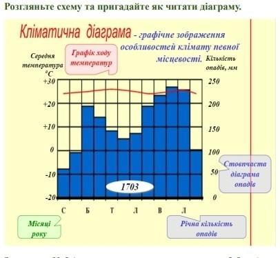 Відповідь:Кліматограма, як правило, представляє собою набір гістограм (12 блоків, за числом місяців у році), або ліній ходу показників кліматичних елементів. Знизу відкладають час із літерним позначенням місяців, ліворуч — значення температури повітря (температурна шкала), праворуч — кількість атмосферних опадів (шкала опадів). Червоним позначають хід середніх значень температури, синім — атмосферних опадів. Для температури графічно виділяють перехід через 0 °C, тобто морозний період. Його можна позначити на температурній кривій синім (або чорним) кольором, горизонтальною лінією. Висота стовпчиків показує кількість атмосферних опадів за місяць. Окремим числом подають річну кількість атмосферних опадів. Обчисливши коефіцієнт випаровуваності, можна графічно показати посушливі та дощові сезони. Окрім того для пункту спостереження подають висоту над рівнем моря.
