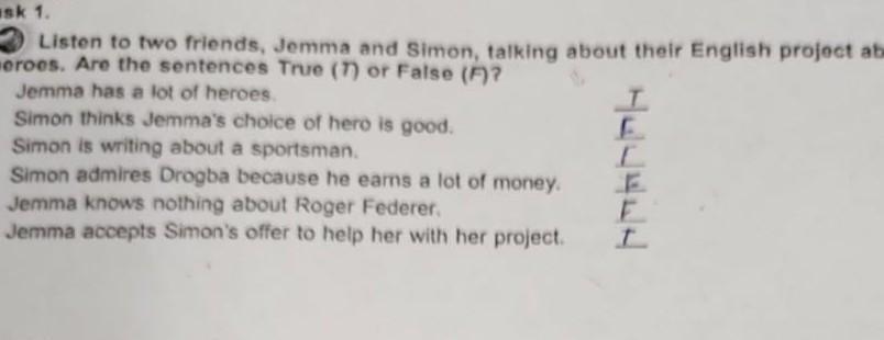 Что бы выполнить это задание ты должна послушать аудио по заданию. А потом уже писать правда/не правда. Если бы у тебя бы в задание было бы аудио я бы его послушала и помогла(((
