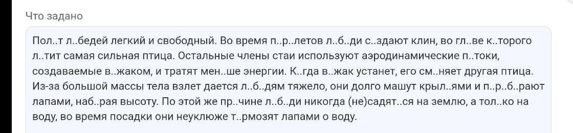 Что задано спишите вставляя пропушеные буквы придумайте название текста выполните марфологический разбор выделенных имен существительных Пол..т л..бедей легкий и свободный. Во время п..р..летов л.....ди с..здают клин, во гл..ве к..торого л..тит самая сильная птица. Остальные члены стаи используют аэродинамические п..токи, создаваемые в..жаком, и тратят мен..ше энергии. К..гда в..жак устанет, его см..няет другая птица. Из-за большой массы тела взлет дается л.....дям тяжело, они долго машут крыл...ями и п...р..б..рают лапами, наб..рая высоту. По этой же пр..чине л.....ди никогда (не)садят..ся на землю, а тол..ко на воду, во время посадки они неуклюже т..рмозят лапами о воду. с