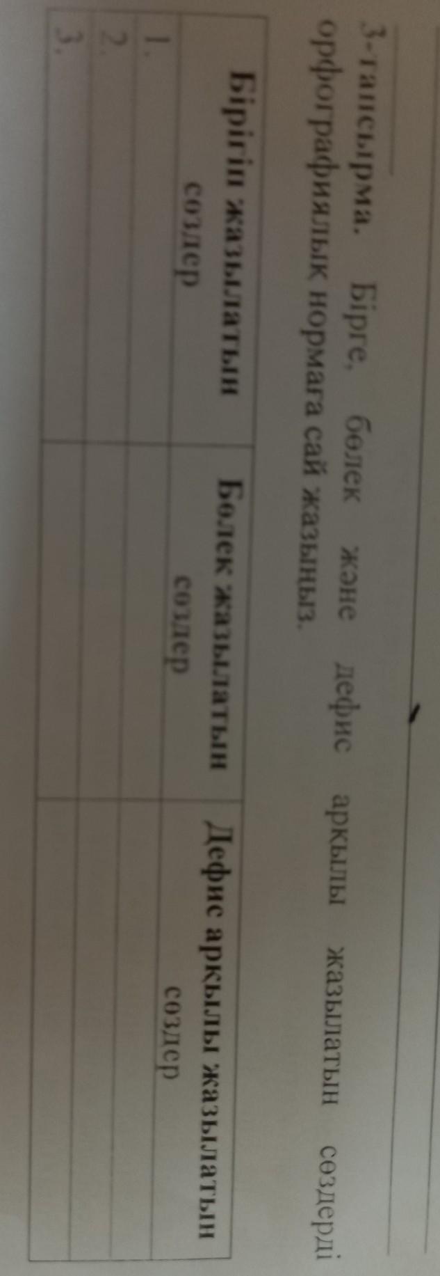 3-тапсырма. Бірге, болек және дефис аркылы жазылатын сөздерді орфографиялык нормага сай жазыныз Бiрiгiп жазылатын создер Болек жазылатын создер Дефис аркылы жазылатын создер
