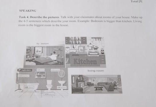 SPEAKING Task 4. Describe the pictures. Talk with your classmates about rooms of your house. Make up the 4-5 sentences which describe your room. Example: Bedroom is bigger than kitchen. Living room is the biggest room in the house. bab My bedroom Kitchen KE living room H