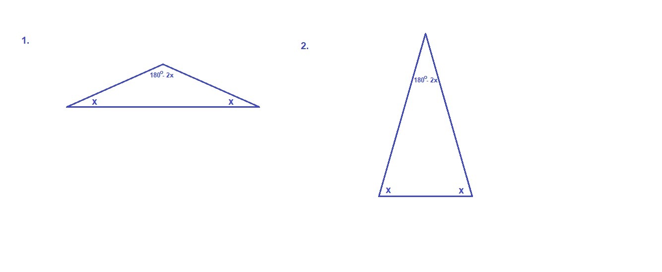 Обозначим их х. Так как сумма углов треугольника равна 180°, то угол при вершине равен (180° - 2х).