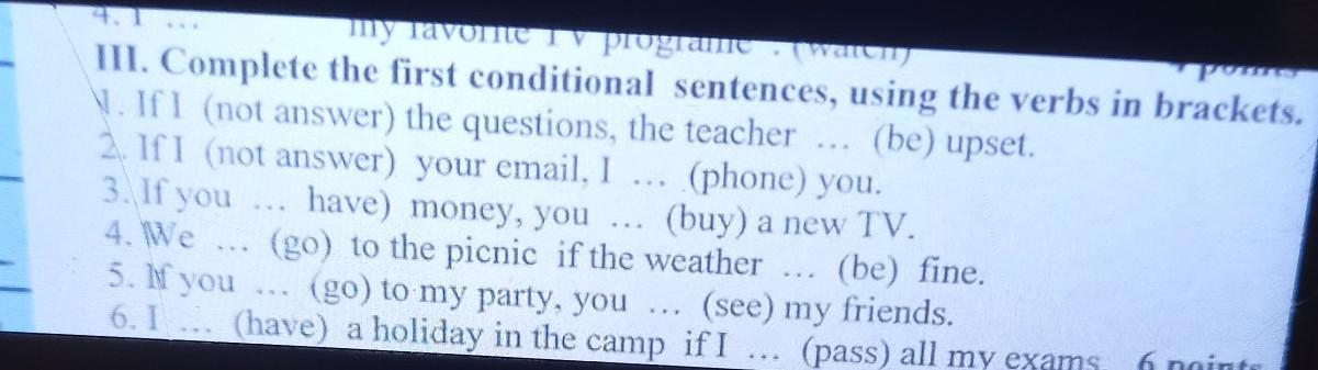 1 my favoritev programe (water) III. Complete the first conditional sentences, using the verbs in bracket 1. If (not answer) the questions, the teacher... (be) upset. 2. If I (not answer) your email, I... (phone) you. 3. If you have) money, you ... (buy) a new TV. (go) to the picnic if the weather 4. We... 5. If you (be) fine. (go) to my party, you... (see) my friends. 6. I... (have) a holiday in the camp if I... (pass) all my exams. 6 poim