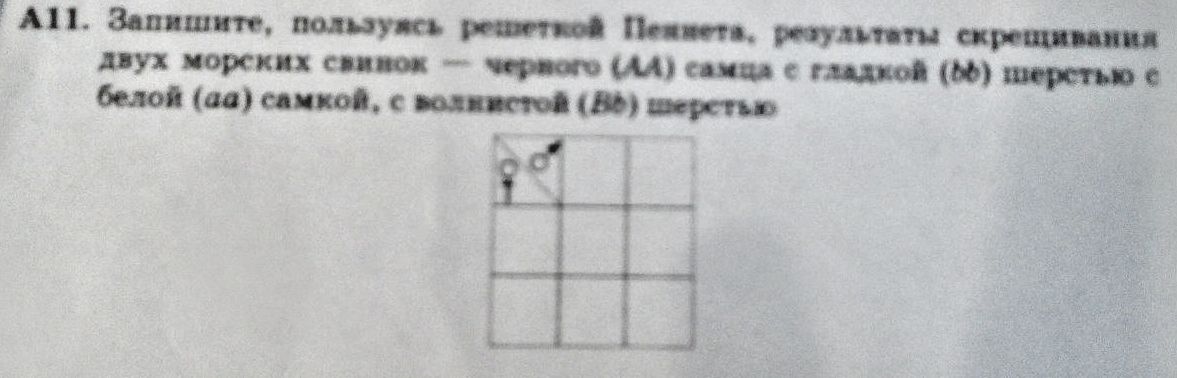 А11: Запишите, пользуясь решеткой Пеннета, результаты скрещивания двух морских свинок - черного (АА) самца с гладкой (bb) шерстью с белой (аа) самкой, с волнистой (Bb) шерстью.