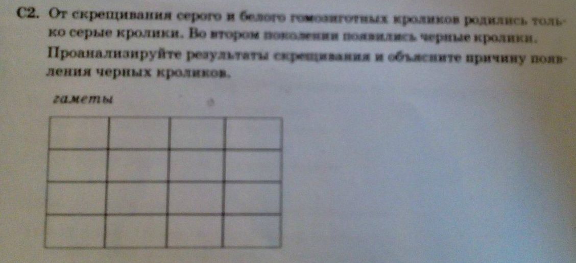 С2: От скрещивания серого и белого гомозиготных кроликов родились только серые кролики. Во втором поколении поколении появились черные кролики. Проанализируйте результаты скрещивания и объясните причину появления черных кроликов.