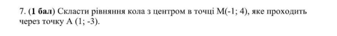 7. (1 бал) Скласти рiвняння кола з центром в точці М(-1; 4), яке проходить через точку А (1; -3).