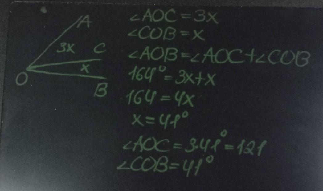 Угол AOB = 164°. Луч ОС делит его на два угла, градусные меры которых относятся как 3:1. Найдите эти углы.