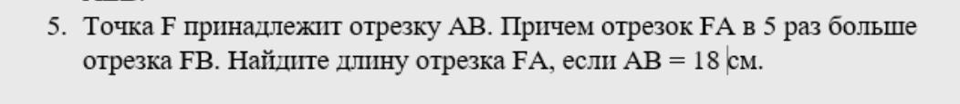 5. Точка F принадлежит отрезку АВ. Причем отрезок FA в 5 раз больше отрезка FB. Найдите длину отрезка FА, если АВ = 18 см.