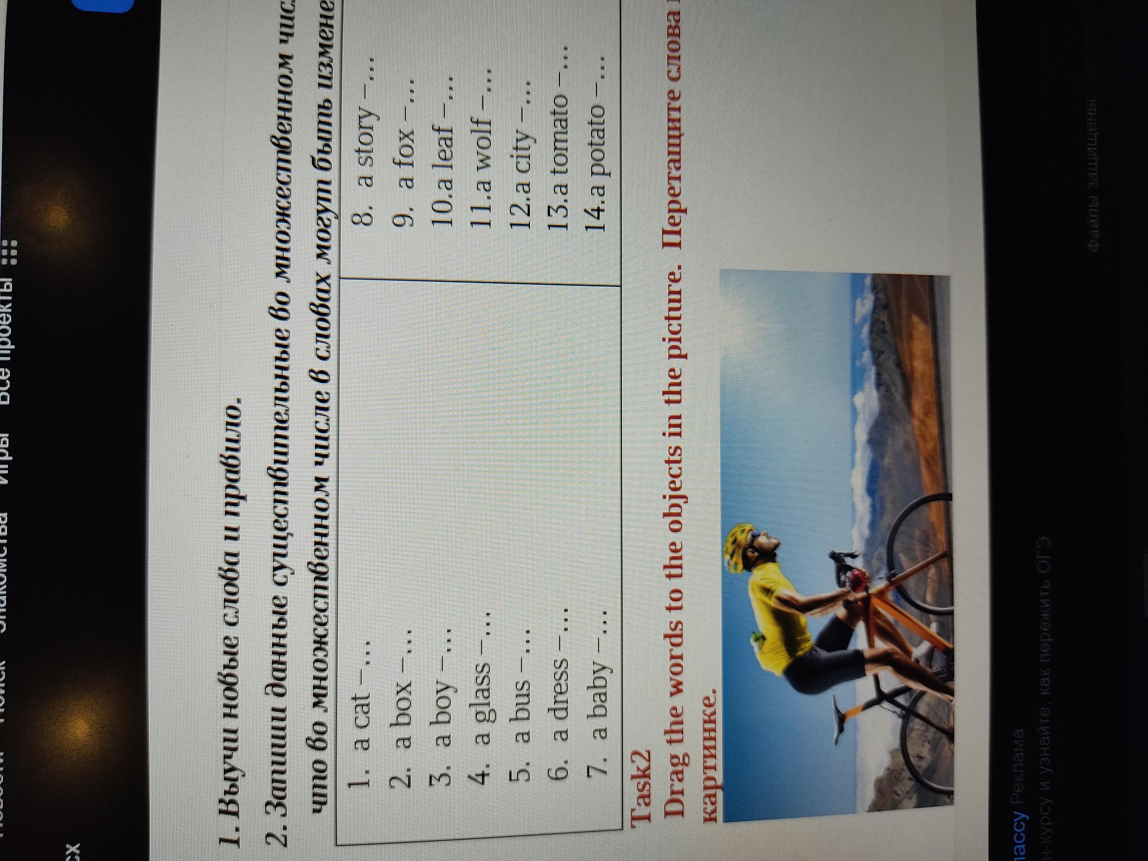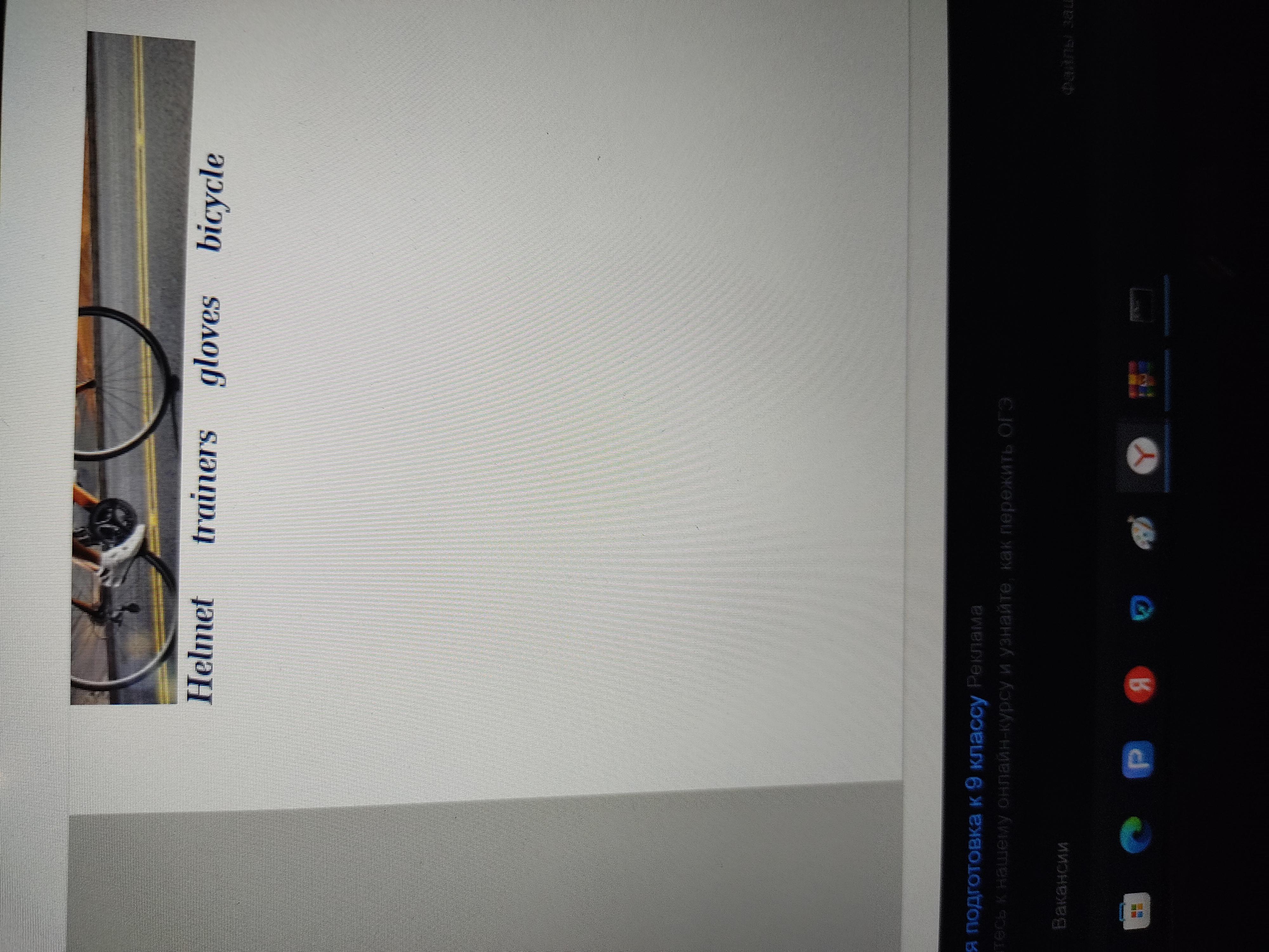helmet – шлем, trainers – кроссовки, gloves – перчатки, bicycle – велосипед