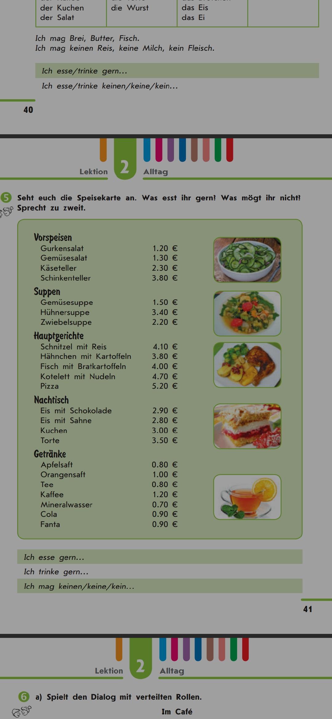 ich esse gern Reis mit Schnitzel und trinke Orangensaft oder Cola,aber ich mag keine Gemüsesuppe und Zwiebelsuppe