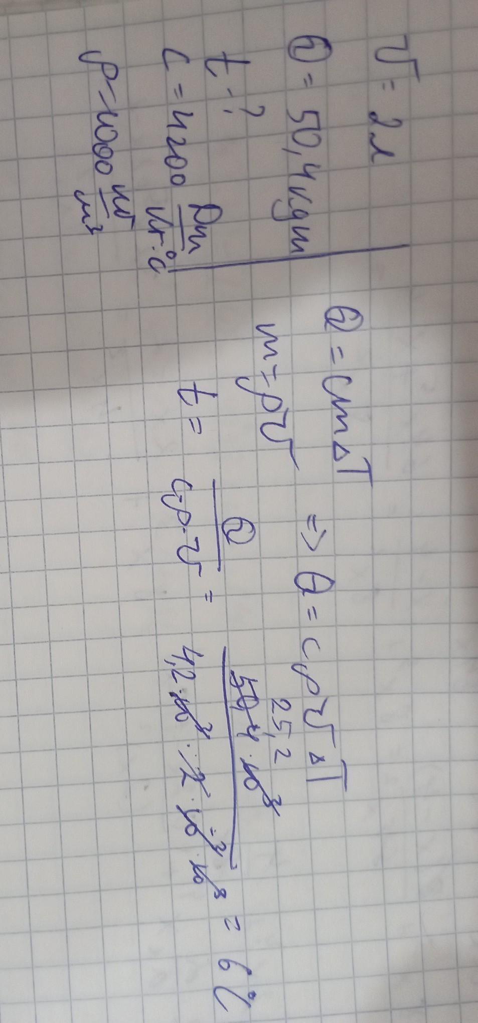 Воду объемом 2 л нагрели в кастрюле и передали ей 50,4 кДж теплоты?На сколько градусов нагрелась вода?