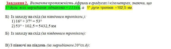 Визначте протяжність Африки в градусах і кілометрах знаючи що 1° дуги всіх мередіанів однакова = 111км, а 1° дуги тропіків = 102, 5 км.