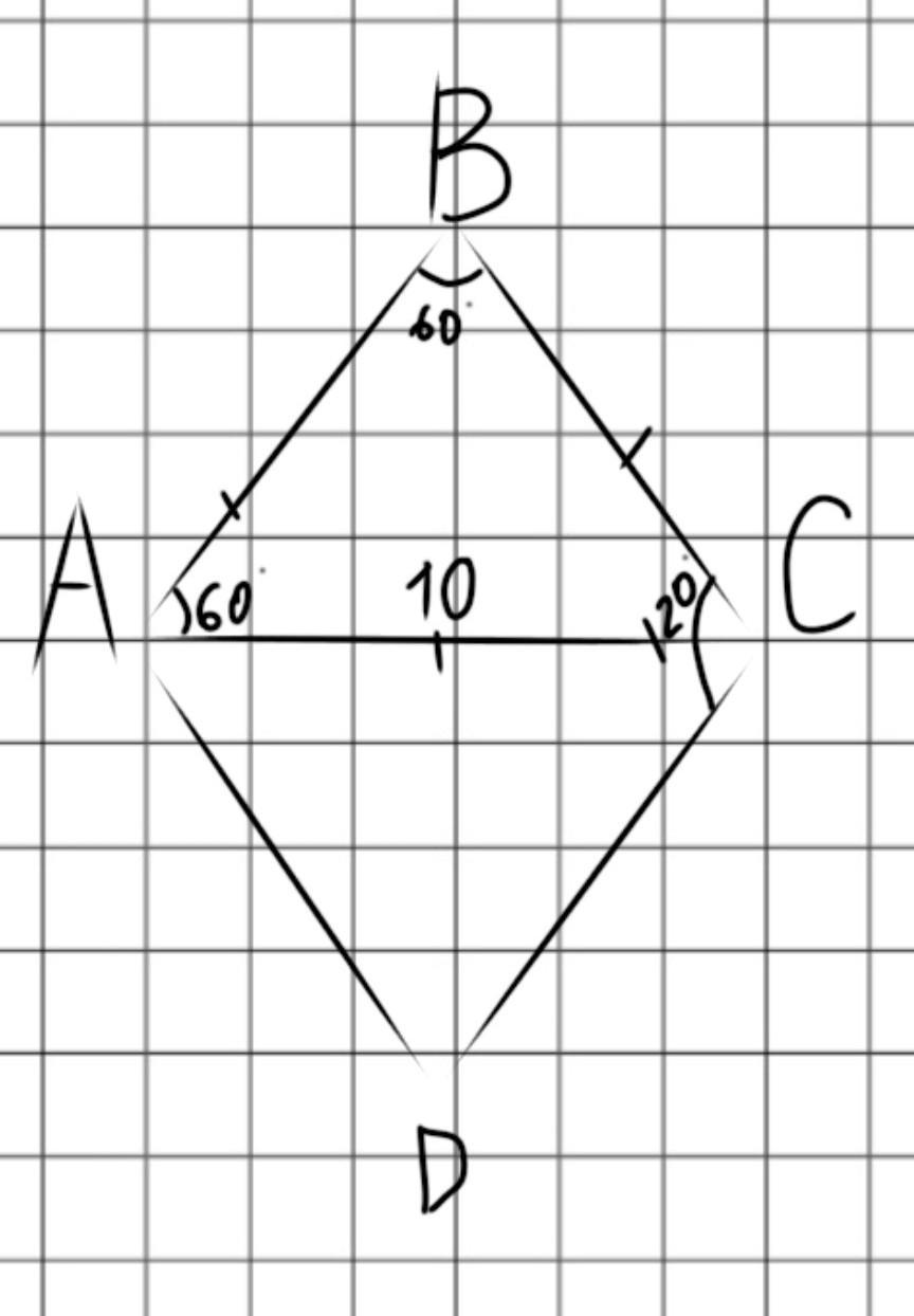 гострий кут буде 60°, тому менша діагональ утворить 2 рівних малих трикутника, сторони яких будуть рівні даній діагоналі, тобто 10 см, тому сторона ромба також дорівнює 10 см