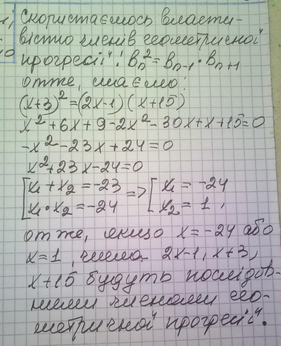 При якому значенні х числа 2х - 1, х + 3 і х + 15 будуть послідовними членами геометричної прогресії? Знайдіть ці числа.