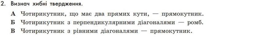 2. Визнач хибні твердження. А Чотирикутник, Б Чотирикутник що має два прямих кути, з перпендикулярними в Чотирикутник з рівними діагоналями прямокутник. діагоналями ромб. прямокутник.