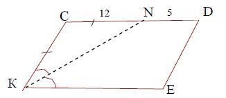 8. У паралелограмi KCDE проведено бісектрису кута СКЕ, яка перетинає сторону CD в точцi N i подiляє п на вiдрiзки 12 см i 5 см. Знайди периметр паралелограма. (2 бали)