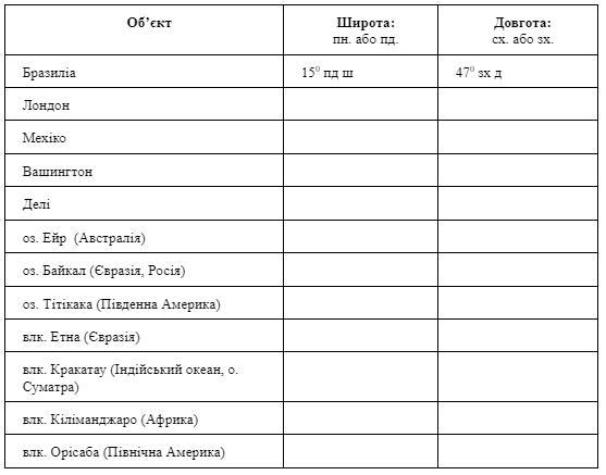 Бери карту світу і по паралелям та мередіанам шукай точки, в яких знаходяться ці об'єкти.