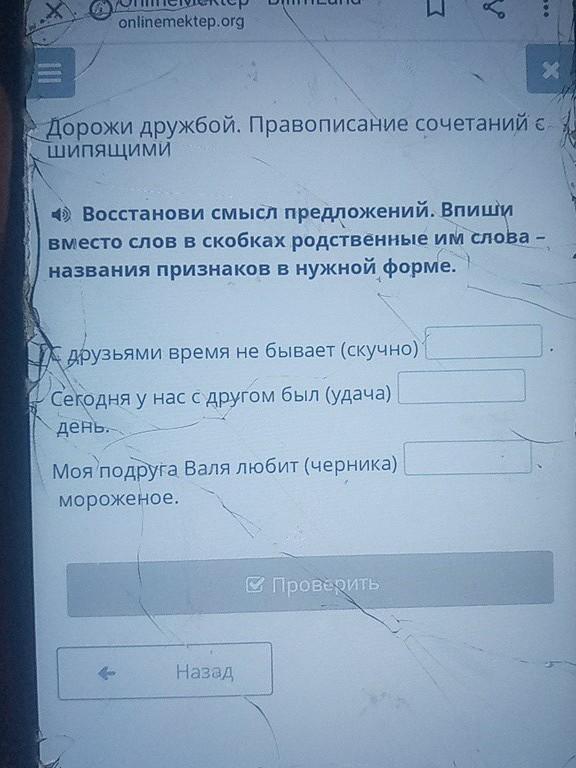 друзьями время не бывает (скучно) Сегодня у нас с другом был (удача) день. Моя подруга Валя любит (черника) мороженое. Проверить