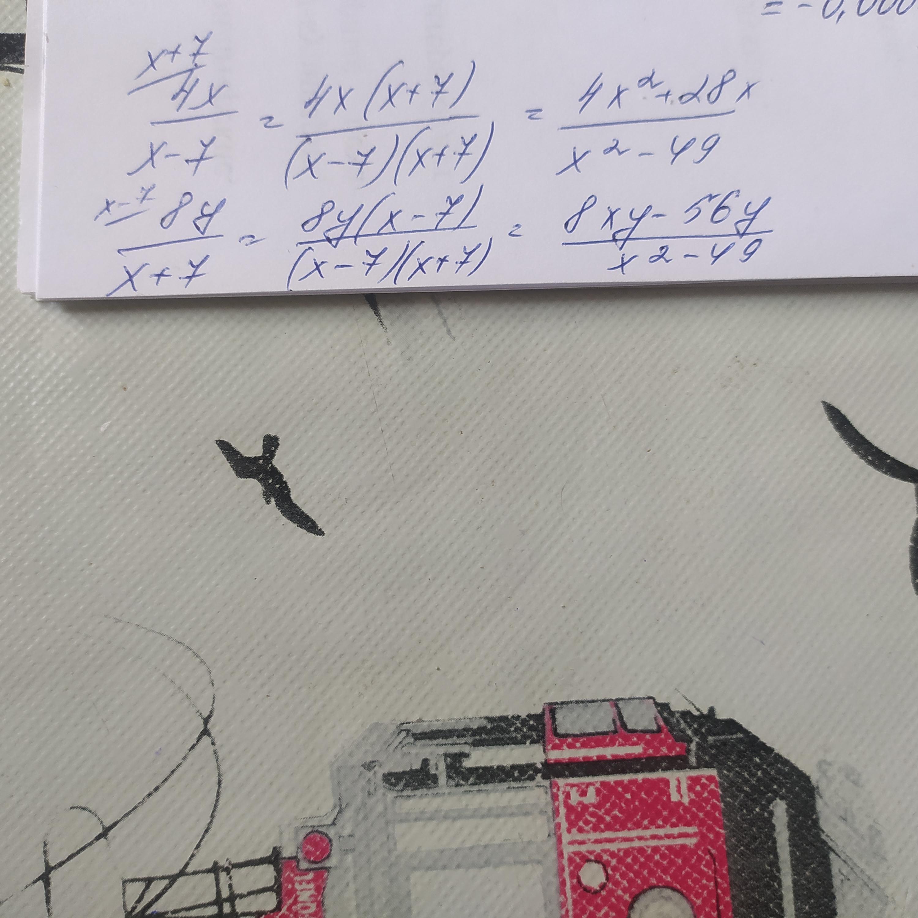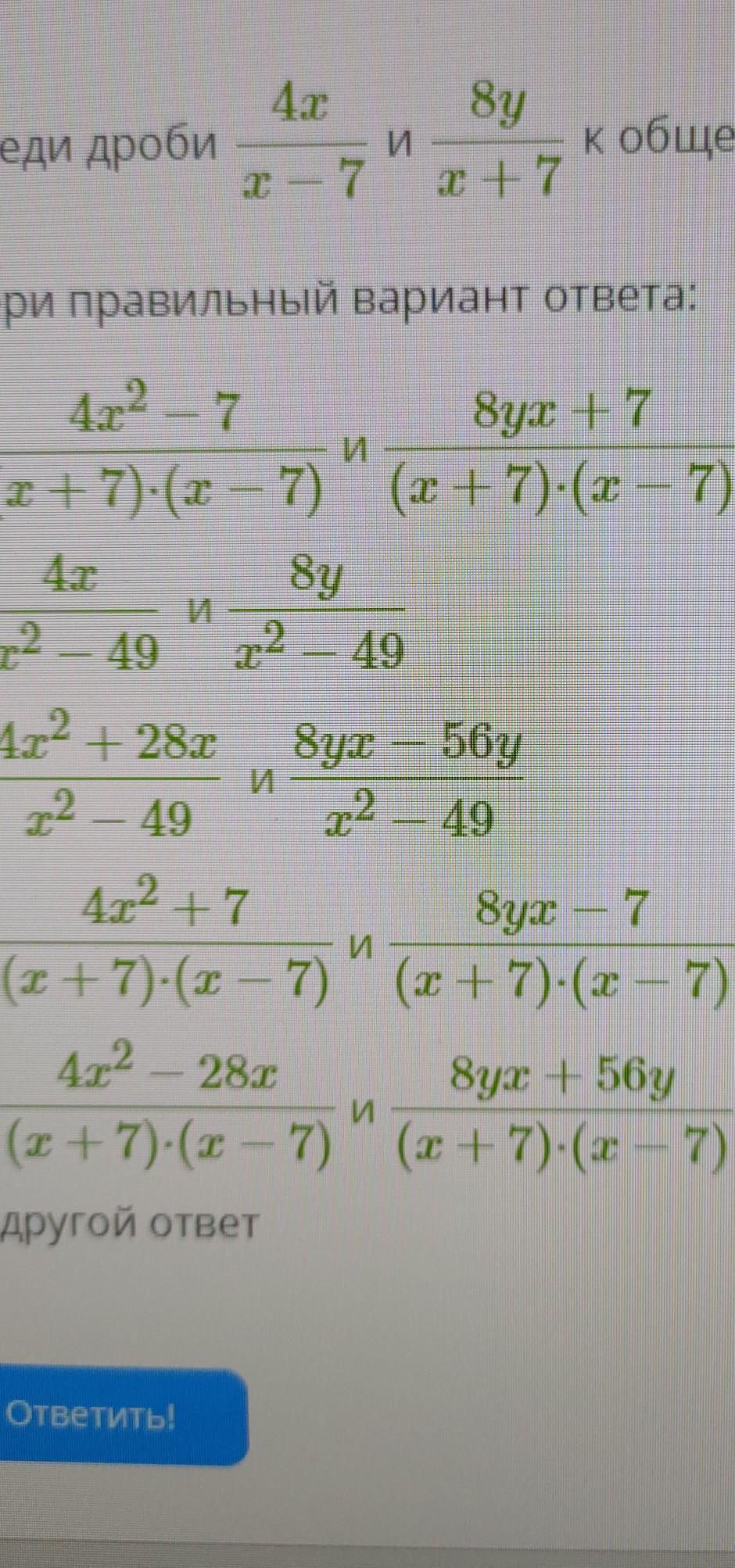 Приведи дроби о за о О Выбери Правильный вариант ответа: 4x² -7 8yx +7 И (x+7)-(x − 7)″ (x+7)-(x − 7) 4T x2 - 49 4x2 + 28x 2-49 И Ат 8y И x - 7 x+7 апия Ответить! Sy т2 - 49 И к общему знаменателю. 8yx - 56y - 2 - 49 4x² +7 8yx - 7 (x + 7)-(x − 7)″ (x + 7)-(x − 7) 4x² 28x (x+7)-(x−7) другой ответ 8yx + 56y (x+7)-(x − 7). Перевести дробь к общему знаменателю
