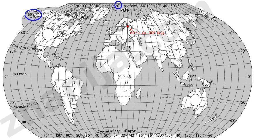 К ответу прикреплена карта с обозначенной точкой А с координатами 60° с.ш. 30° в.д.