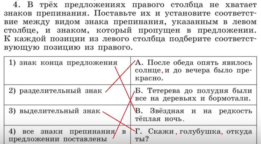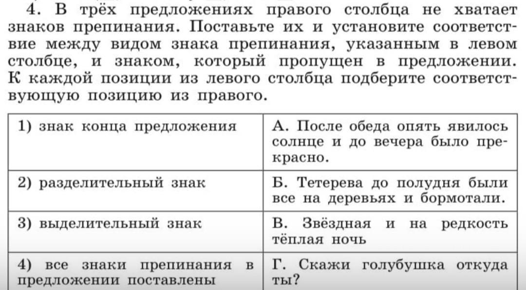 4. В трёх предложениях правого столбца не хватает знаков препинания. Поставьте их и установите соответст- вие между видом знака препинания, указанным в левом столбце, и знаком, который пропущен в предложении. К каждой позиции из левого столбца подберите соответст- вующую позицию из правого.