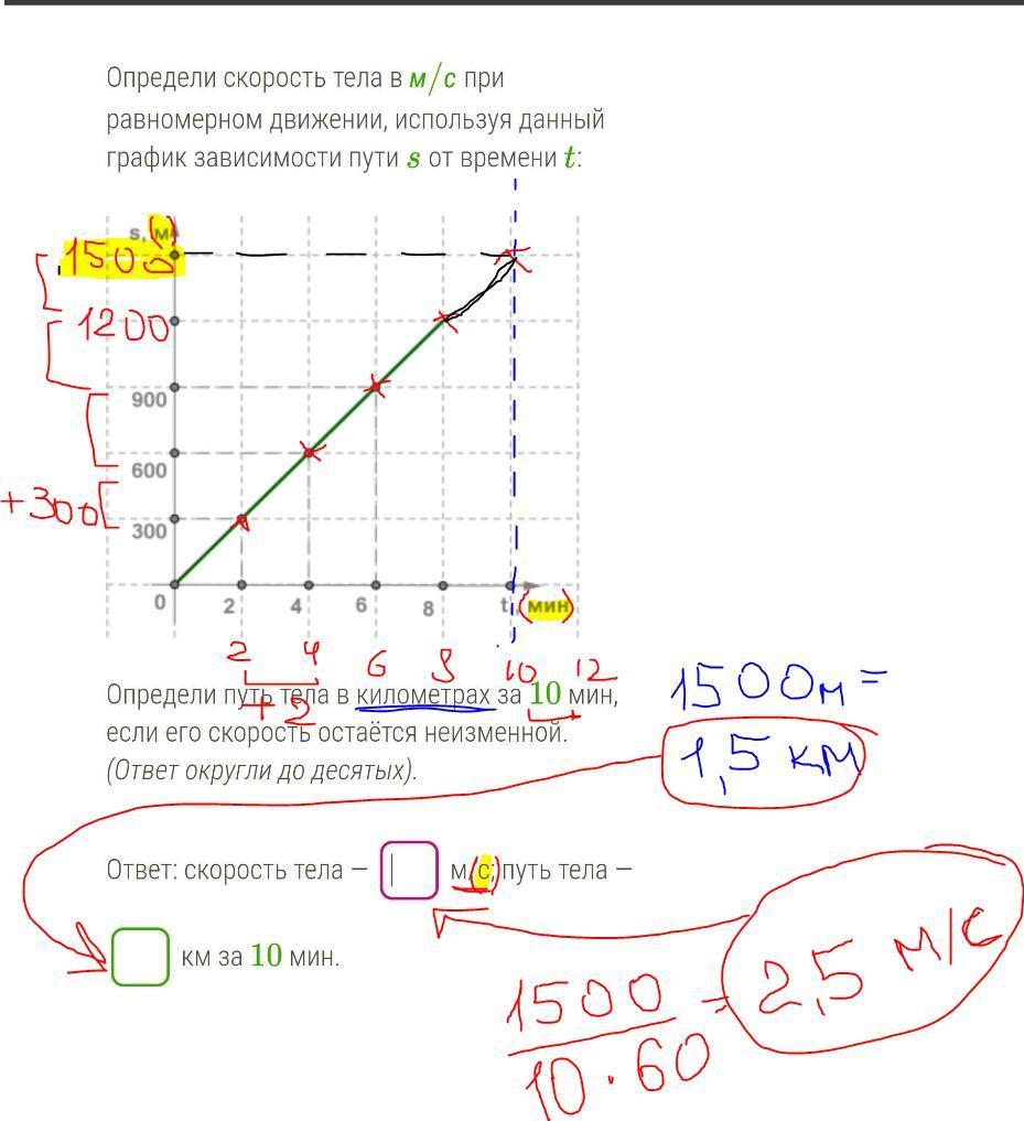 Щоб отримати швидкість в метрах на секунду треба перевести наші хвилини в секунди. Швидкість 1500 метрів / 10 хвилин - це 1500м/10*60с (секунд) = 1500м/600с = 2,5 м/с