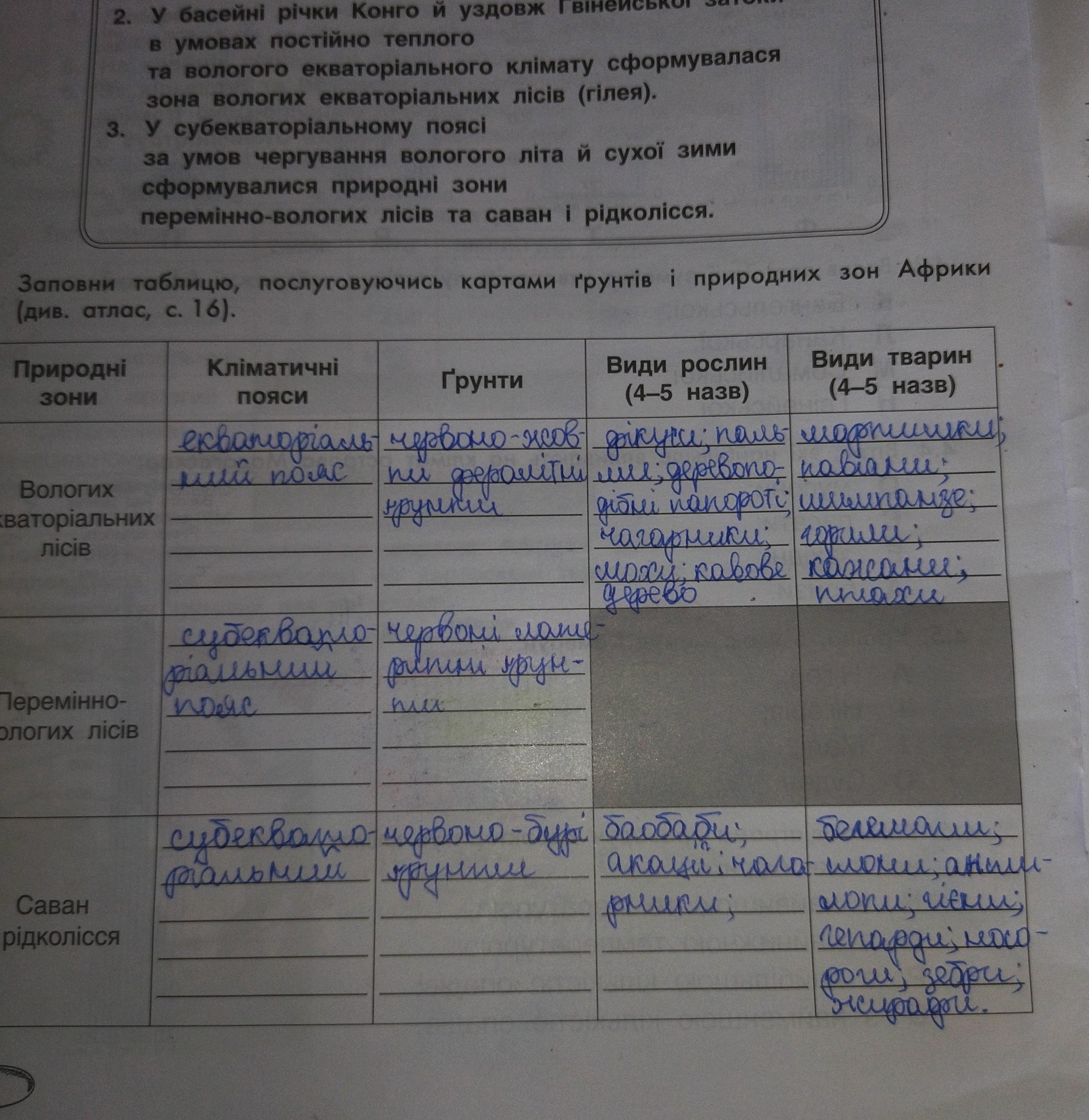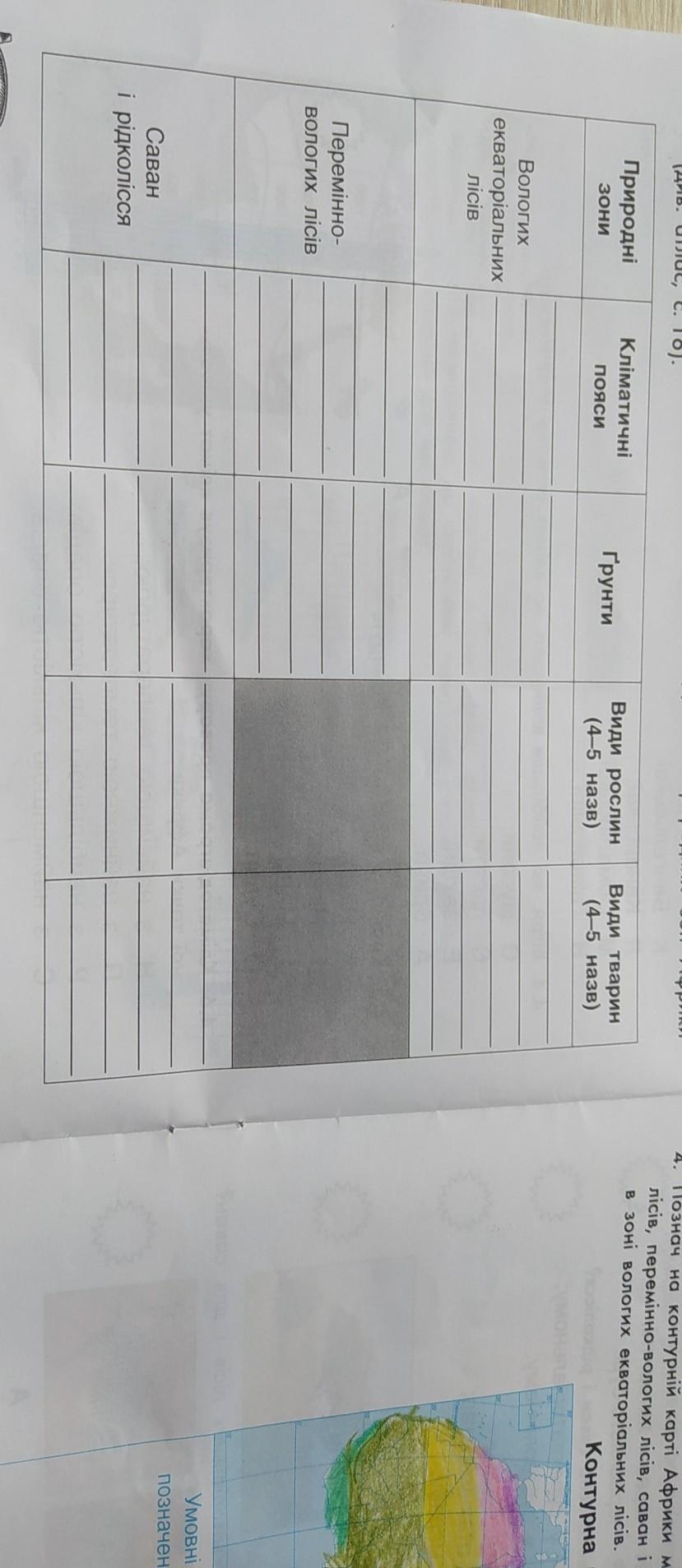2. Заповни таблицю, послуговуючись картами ґрунтів і природних зон Африки (див. атлас, с. 16).