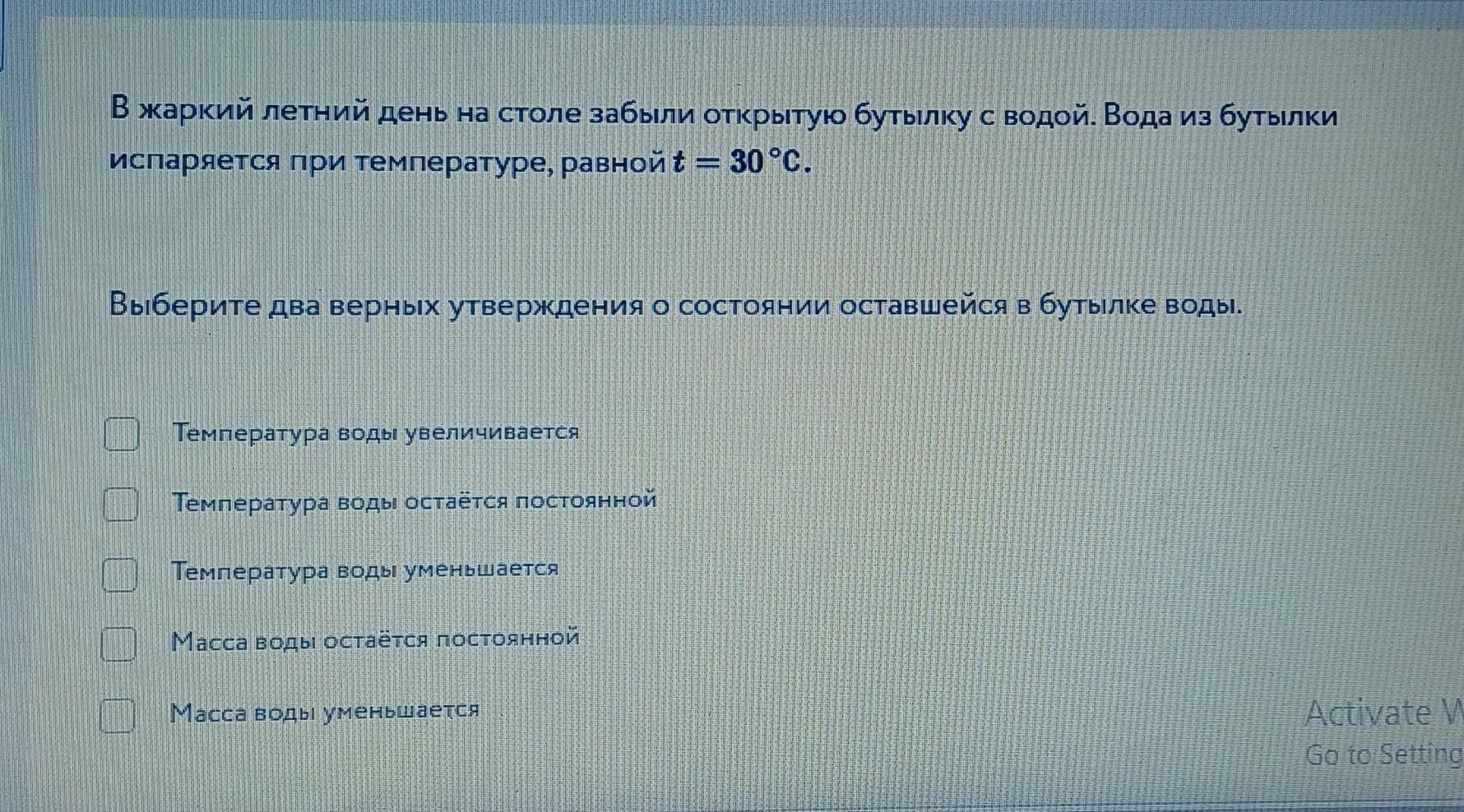 ВЫБЕРИТЕ ДВА ВЕРНЫХ УТВЕРЖДЕНИЯ О СОСТОЯНИИ ОСТАВШЕЙСЯ В БУТЫЛКЕ ВОДЫ.
