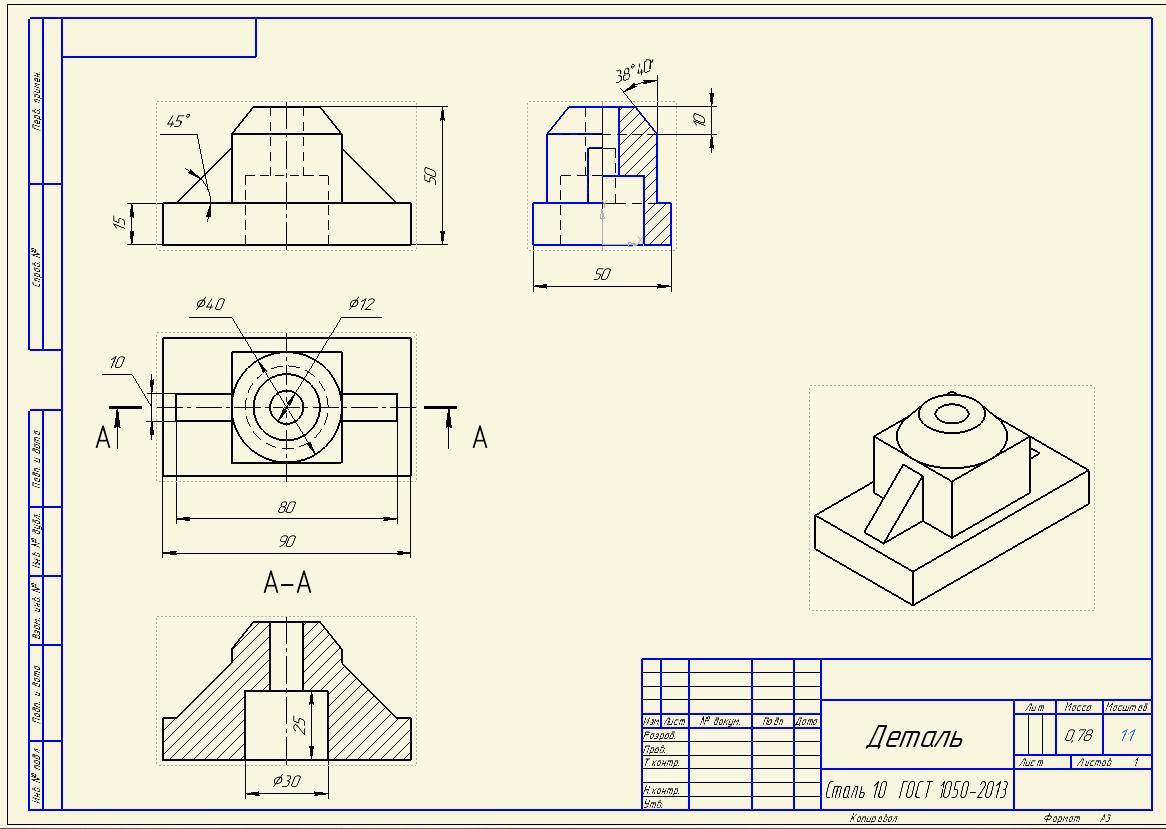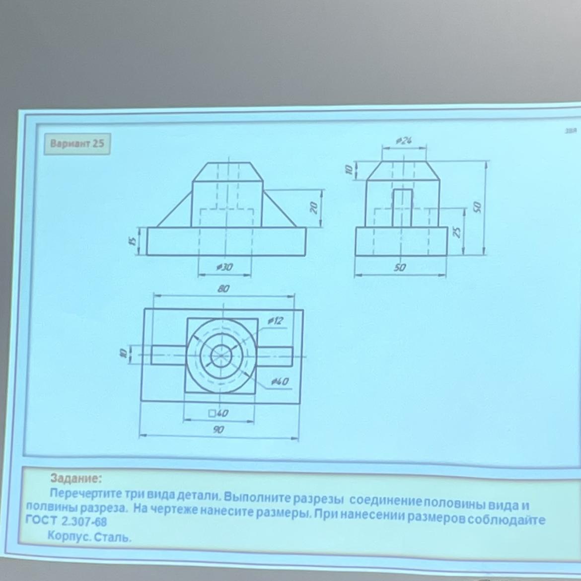 Перечертите три вида детали. Выполните разрезы соединение половины вида и