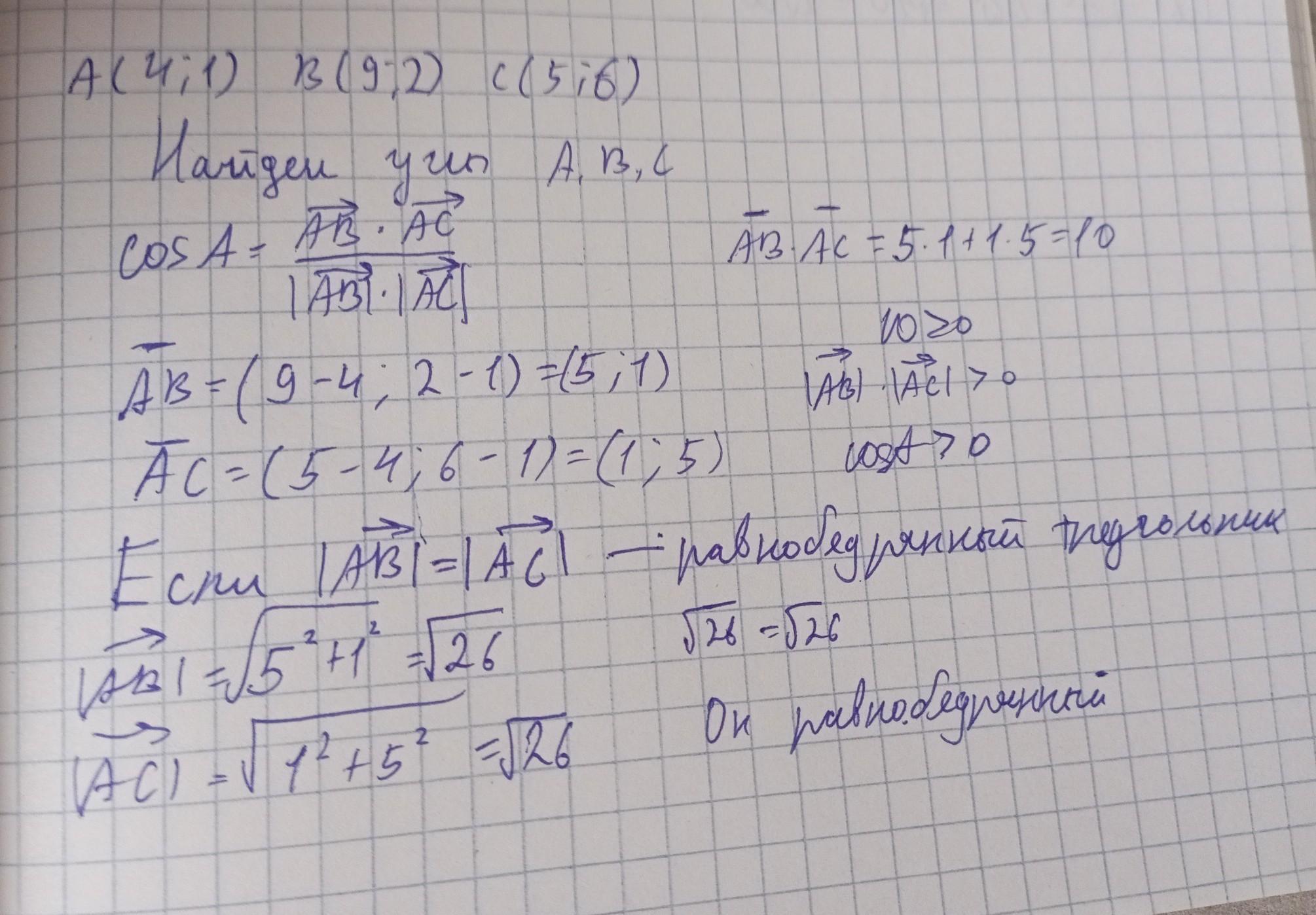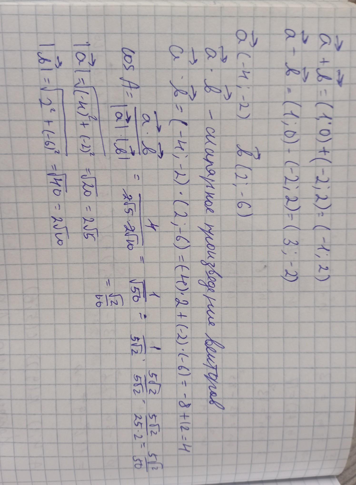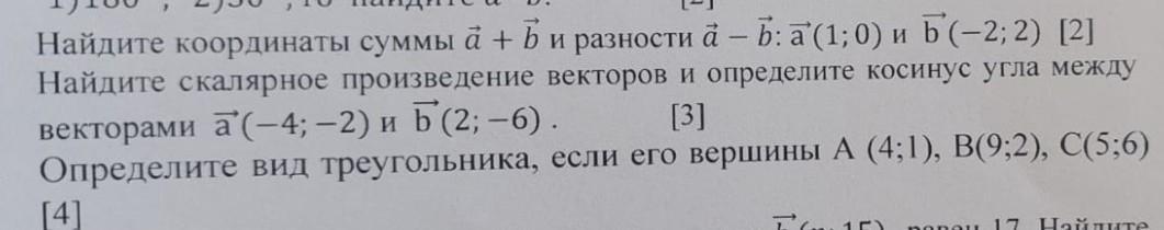 СРОЧНО!!! Найдите координаты суммы a + b и paзнocтиà-b: ā(1; 0) и Б(-2; 2) [2] Найдите скалярное произведение векторов и определите косинус угла между векторами ā'(-4; -2) и Б(2; -6) . [3] Определите вид треугольника, если его вершины А (4;1), B(9;2), C(5;6)