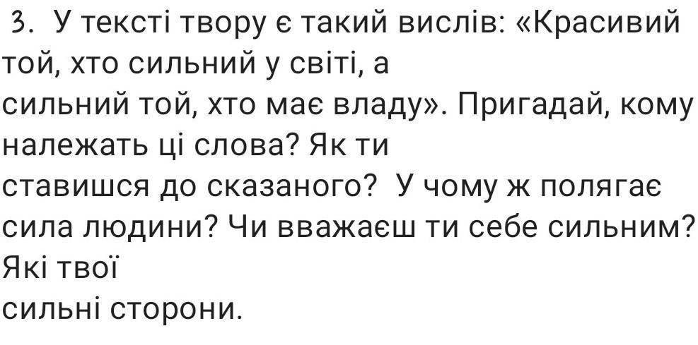 3. У тексті твору є такий вислів: «Красивий той, хто сильний у світі, а сильний той, хто має владу». Пригадай, кому належать ці слова? Як ти ставишся до сказаного? У чому ж полягає сила людини? Чи вважаеш ти себе сильним? Які твої сильні сторони. 20 балів срочно!!!
