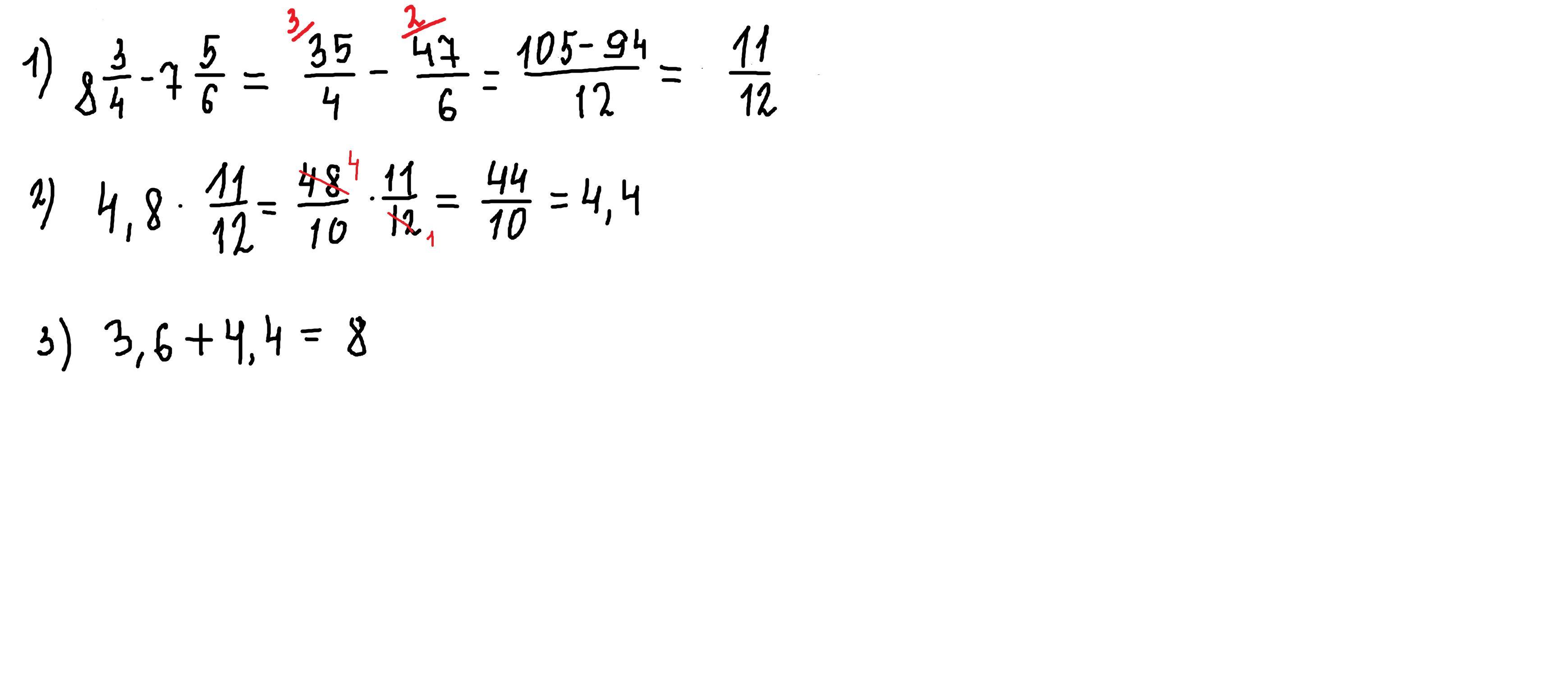 2) 4,8 * 11/12 = 4 8/10 * 11/12 = 48/10 * 11/12 = 4/10 * 11/1 = 44/10 = 4,4