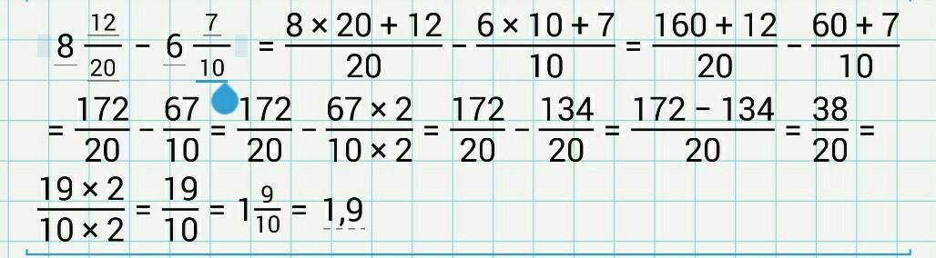 8 12/20 - 6 7/10 = 8 12/20 - 6 14/20 = 7 32/20 - 6 14/20 = 1 18/20 = 1 9/10