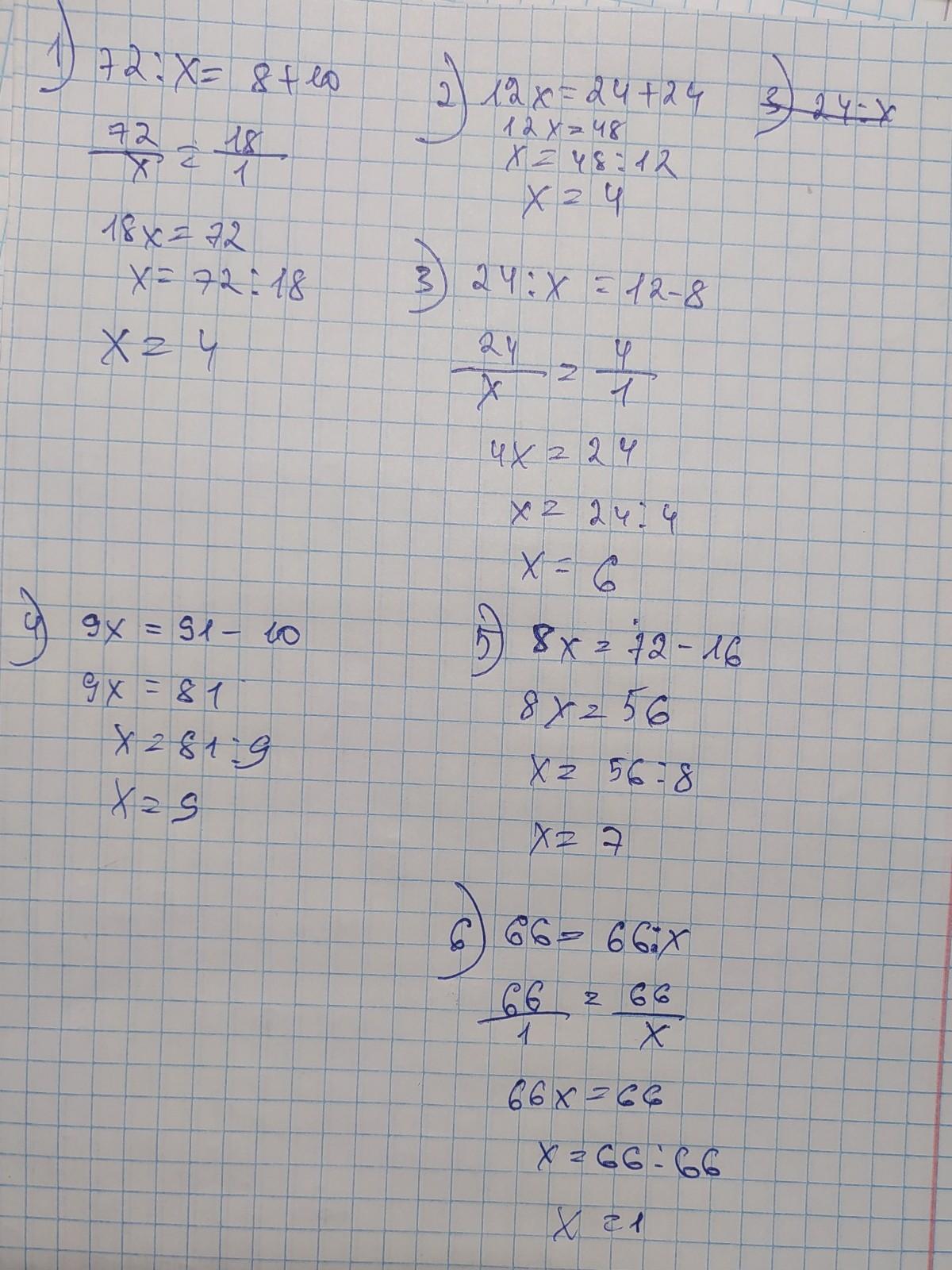 1)72:x=8+10 , 2)12x=24+24 , 3)24:x=12-8 , 4)9x=91-10 , 5)8x=72-16 , 6)66=66:x