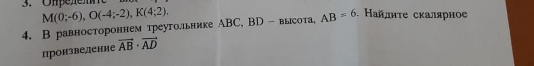4. В равностороннем треугольнике ABC, BD произведение AB.AD высота, AB = 6. Найдите скалярное