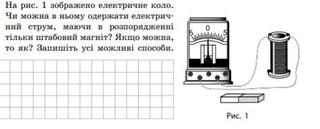 На рис. 1 зображено електричне коло. Чи можна в ньому одержати електрич ний струм, маючи в розпорядженнi тiльки штабовий магнiт? Якщо можна, то як? Запишіть усі можливі способи.