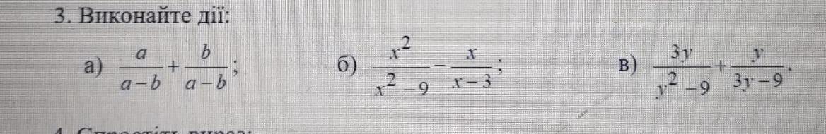 1. (a + b)/(a - b). 2) - (3x)/(x ^ 2 - 9). 3) (12y + y ^ 2)/(3y ^ 2 - 27)