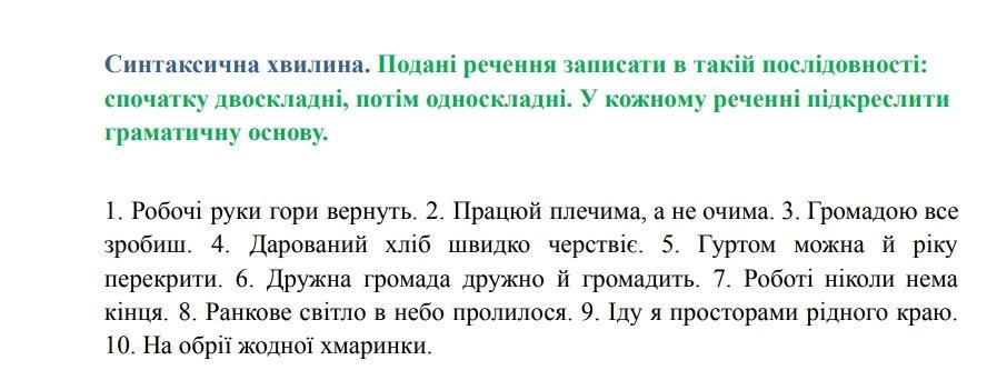 1. Двоскладне, руки - підмет, вернуть - присудок. 4. Двоскладне, хліб - підмет, черствіє - присудок. 6. Двоскладне, громада - підмет, громадить - присудок. 8. Двоскладне, світло - підмет, пролилося - присудок. 9. Двоскладне,я - підмет, іду - присудок. 2. Односкладне, працюй присудок. 3. Односкладне, зробиш - присудок. 5. Односкладне, перекрити присудок. 7. Односкладне. 10. Односкладне, хмаринки підмет.