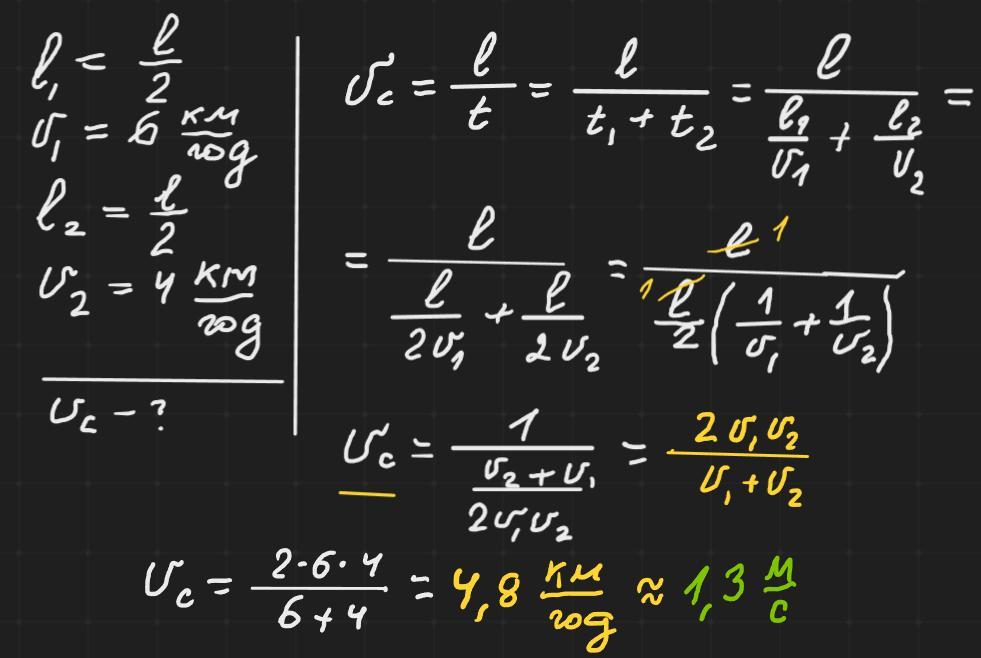 Визначте середню швидкість водного катамарана, якщо першу половину шляху він рухався зі швидкістю 6 км/год, а другу-зі швидкістю 4 км/год. Відповідь подати у м/с, округливши до десятих.