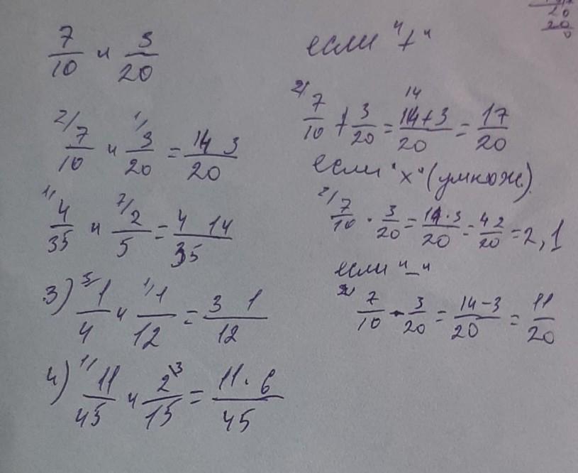 212. Приведите дроби к общему знаменателю: 1) 7/10 и 3/20; 2) 4/35 и 2/5; 3) 1/4 и 1/12; 4) 11/45 и 2/15