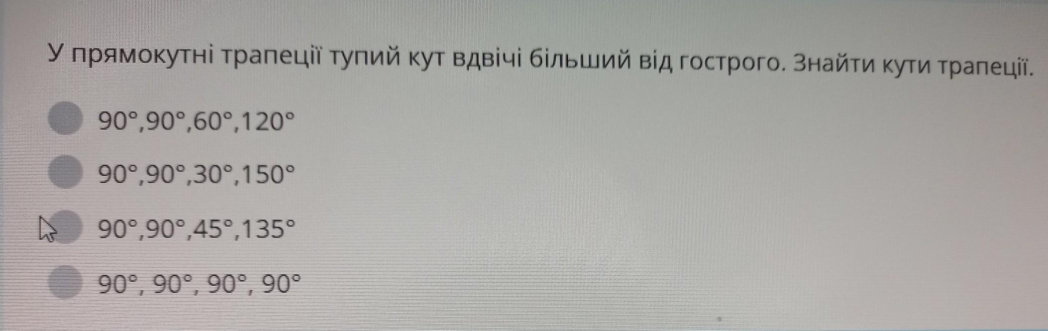 1 перше тому що у прямокутній трапеції два кути по 90° гострий в двічі менший тому дорівнює 60°