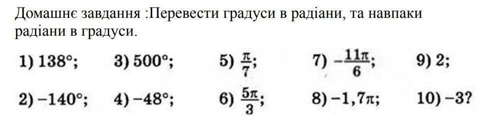 Домашнє завдання :Перевести градуси в радіани, та навпаки радіани в градуси. 1) 138⁰; 2)-140⁰; 3) 500⁰; 4)-48°; 5) 4; 5 п 3 6) 7) -117. 8) -1,7%; 9) 2; 10)-3?